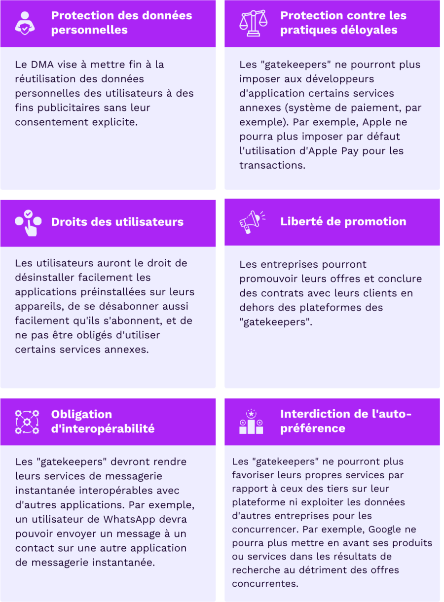 Les entreprises concernées par le Digital Markets Act ont pour obligations de respecter un certain nombre de règles et d’interdictions, et doivent se conformer à ces nouvelles règles d’ici le 6 mars 2024, sous peine d’amende. Voici certains des aspects couverts par ces mesures :