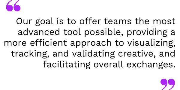 Our goal is to offer teams the most advanced tool possible, providing a more efficient approach to visualizing, tracking, and validating creative, and facilitating overall exchanges.