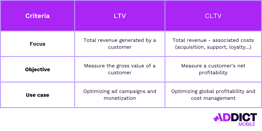 - La LifeTime Value est utile pour estimer la valeur brute d’un client, ce qui permet d’évaluer les performances d’acquisition et de monétisation.