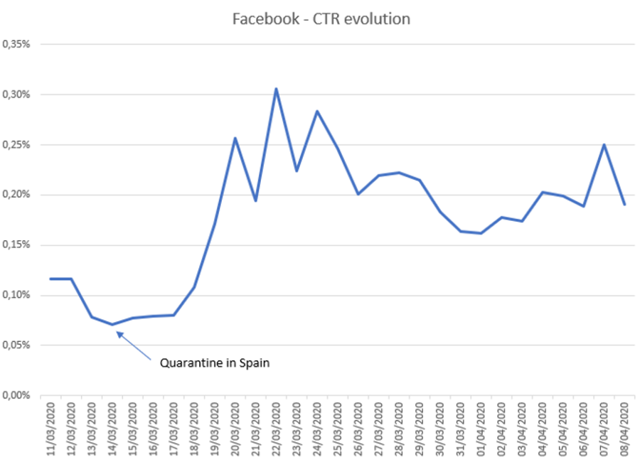 Adapting the creative assets has helped increase the campaigns ROI by addressing the users in the right way. This can be seen very clearly below in the click rate evolution on the ads: