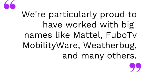 It’s tough to pick just one example given our journey. Still, we’re particularly proud to have worked with big names like Mattel, MobilityWare, fubotv, Weatherbug, and many others.