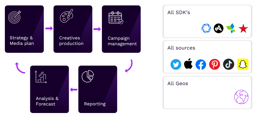 - Our “all-in-one” service, which offers comprehensive support covering strategy and media planning, creative production, campaign management, analysis and forecast, reporting, etc. All of this is tailored to all SDKs, sources, geographies, and challenges.