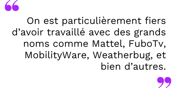 C’est difficile de choisir un seul exemple compte tenu de notre parcours. Mais on est particulièrement fiers d’avoir travaillé avec des grands noms comme Mattel, FuboTv, MobilityWare, Weatherbug, et bien d’autres.