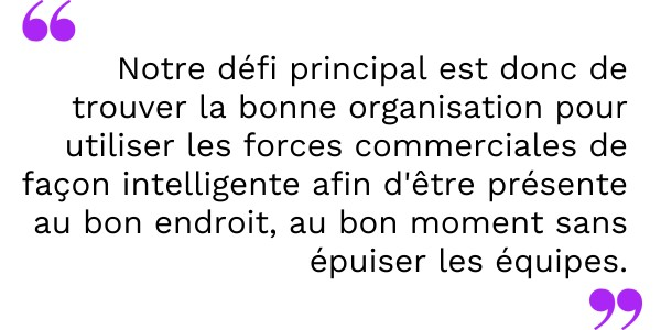 Notre défi principal est donc de trouver la bonne organisation pour utiliser les forces commerciales de façon intelligente afin d’être présente au bon endroit, au bon moment sans épuiser les équipes. Cela passe par la confirmation de notre nouvelle stratégie commerciale avec l’intégration de SDR (Sales Development Representative) chargés d’initier le contact avec les prospects, de qualifier les leads et de les transmettre aux autres commerciaux pour la suite des échanges. Mais aussi la mise en place de moments pour que les équipes puissent se retrouver pour renforcer la cohésion.